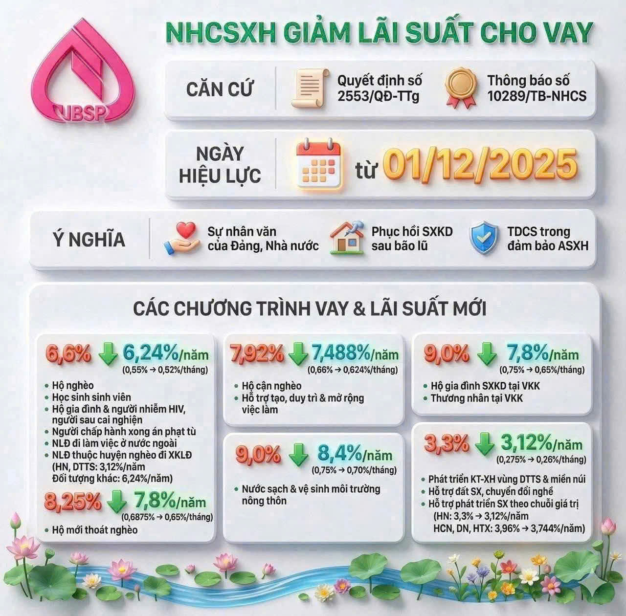 Từ ngày 01/12/2025, lãi suất cho vay chương trình hộ nghèo cùng nhiều chương trình tín dụng chính sách khác do NHCSXH quản lý sẽ được điều chỉnh giảm theo các mức cụ thể sau: