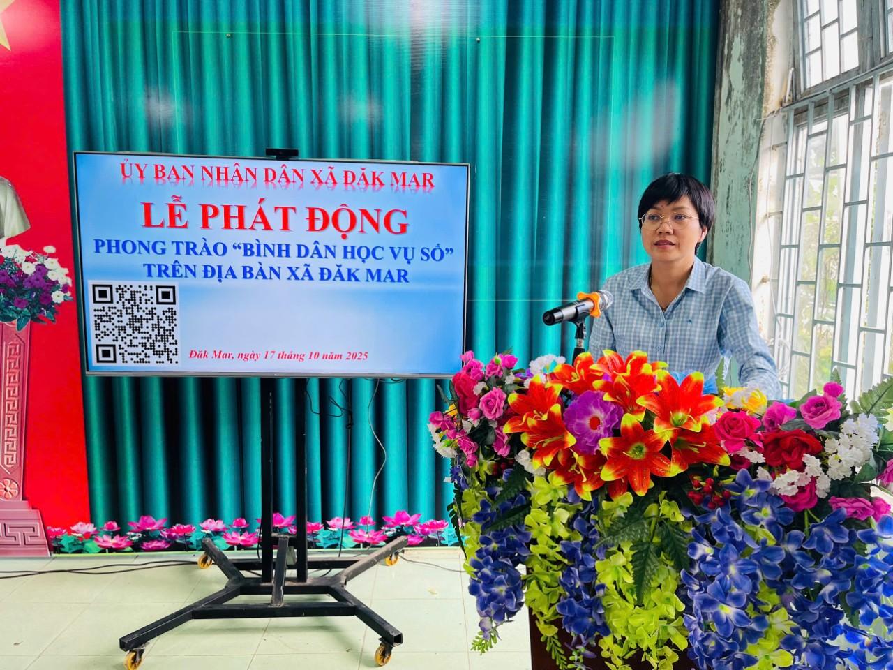 Phát biểu tại Lễ phát động, đồng chí Trần Thị Yến - Phó Bí thư Đảng ủy, Chủ tịch UBND xã, Trưởng ban Chỉ đạo của Ủy ban nhân dân xã Đăk Mar về phát triển khoa học, công nghệ, đổi mới sáng tạo, chuyển đổi số và Đề án 06, nhấn mạnh: “Phong trào “Bình dân học vụ số” không chỉ là nhiệm vụ mà còn là cơ hội để mỗi người dân Đăk Mar trang bị cho mình những kiến thức, kỹ năng số cần thiết, tự tin bắt nhịp với sự phát triển của xã hội hiện đại. Cán bộ, đảng viên phải là những hạt nhân tiên phong, gương mẫu, cùng nhau lan tỏa tinh thần học số, dùng số tới mọi tầng lớp nhân dân.”
