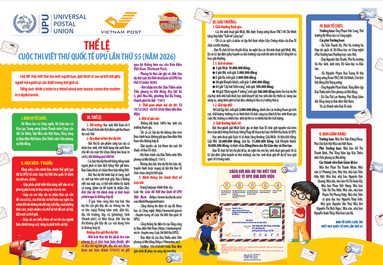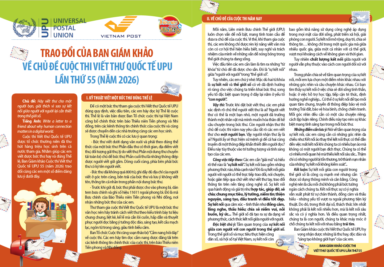 Cuộc thi Viết thư quốc tế UPU là một sân chơi bổ ích, sáng tạo dành cho thiếu nhi, do Liên minh Bưu chính Thế giới (UPU) phát động hàng năm. Năm nay, với chủ đề “Hãy viết thư cho một người bạn, giải thích vì sao sự kết nối giữa người với người lại cần thiết trong thế giới số”, cuộc thi là cơ hội để các em bày tỏ suy nghĩ, cảm xúc về tầm quan trọng của những mối quan hệ chân thật, sự đồng cảm và gắn kết giữa con người trong thời đại công nghệ số phát triển mạnh mẽ.